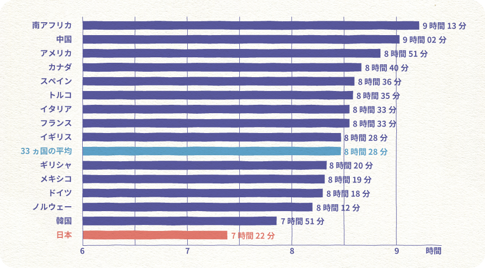 経済協力開発機構(OECD)が33ヵ国を対象に行った1日の睡眠時間(睡眠に充てる時間)調査では、全体平均の8 時間28分より1時間以上短く、日本は7 時間22 分と最短でした。特に、日本の女性は短いと報告されています。