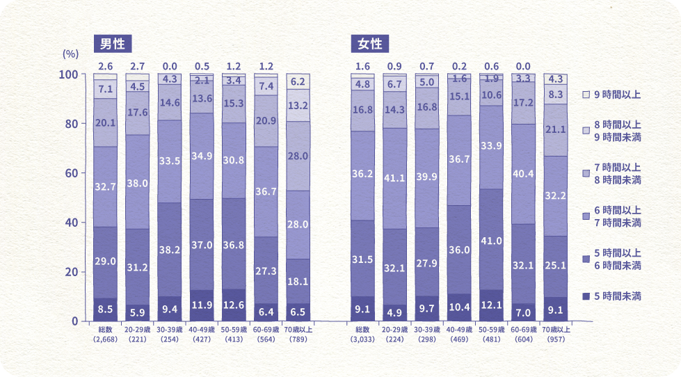 成人の日本人の睡眠時間を性別年齢別にみると、約40%の方の睡眠時間が7時間未満です。特に50歳代の女性は50%以上の方が7時間未満でした。